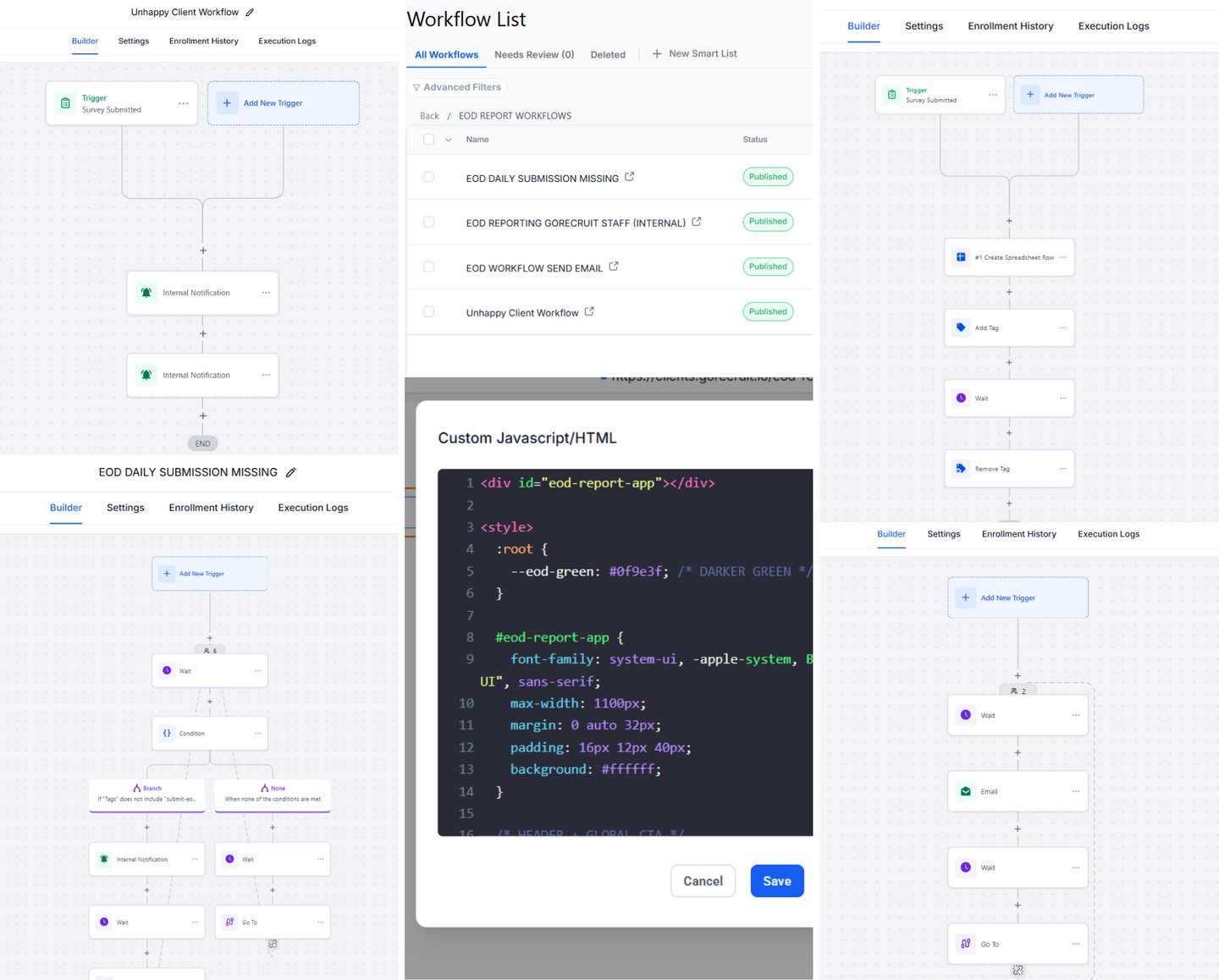 This allows HR to step in, monitor KPI compliance, and resolve issues early—drastically reducing churn and preventing minor problems from turning into major ones. The workflows also ensure operational reliability. If an employee fails to submit their EOD within the required timeframe, the system triggers an internal alert so the team can follow up immediately. This guarantees consistent reporting and keeps everyone accountable without constant oversight. Overall, this system replaces manual tracking, manager follow-ups, and scattered reporting with a fully automated, real-time EOD ecosystem that improves visibility, strengthens performance management, and helps businesses run smoothly at scale.