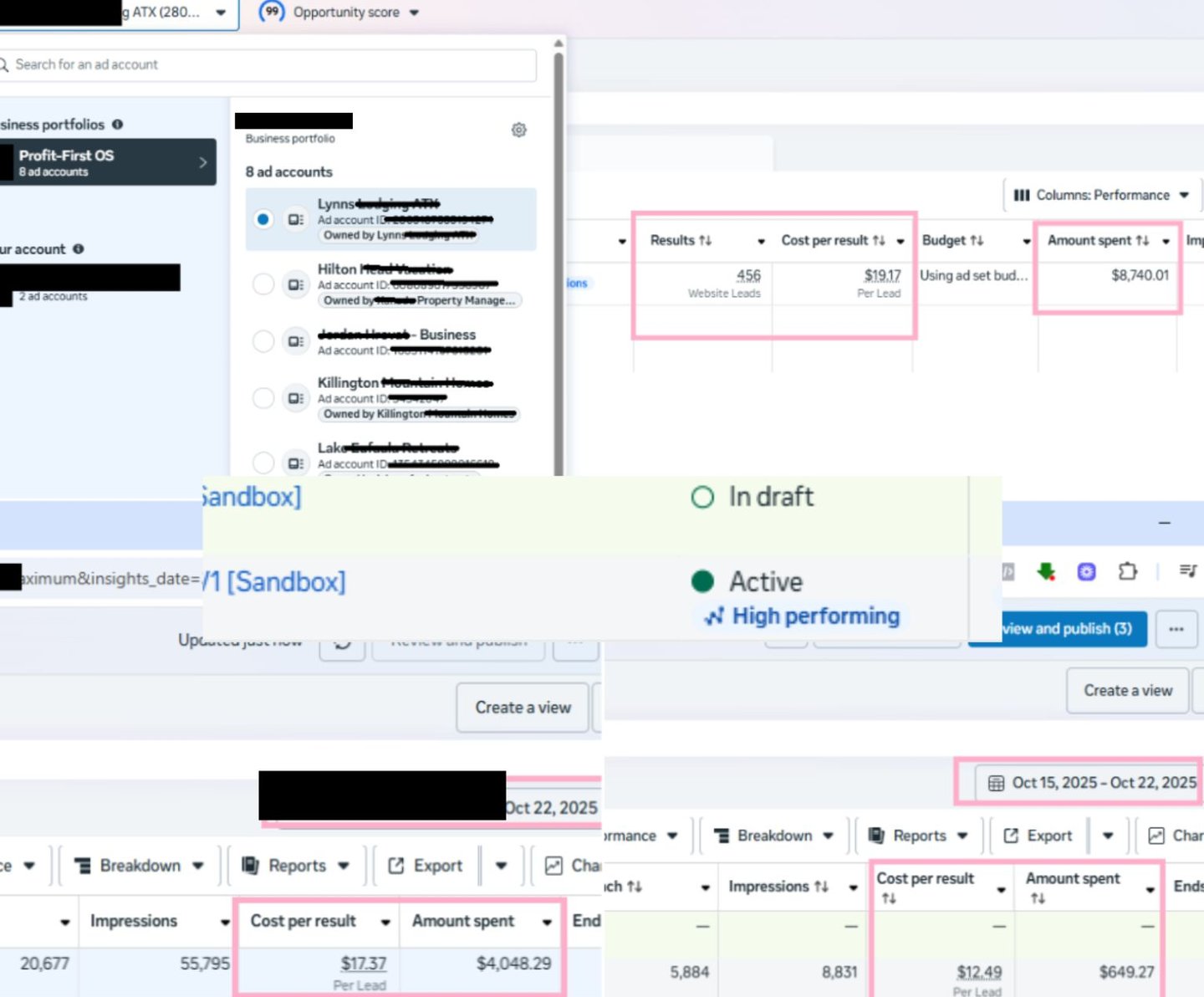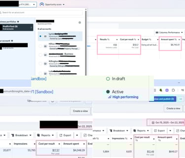 Here’s a glimpse inside some of the ad accounts I’ve managed across multiple industries — each one built using a data-driven client acquisition system, not guesswork or random tactics.
