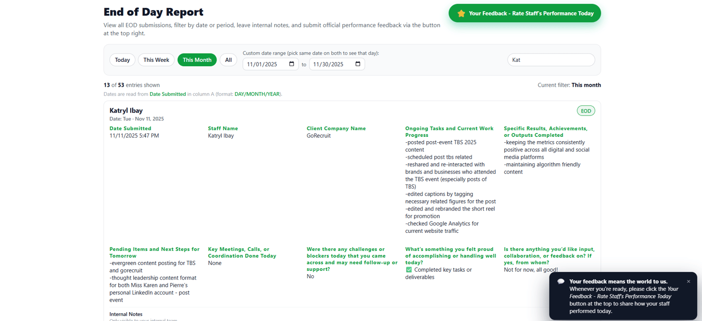 This is a complete End-of-Day (EOD) reporting automation system I built to streamline daily staff accountability, performance tracking, and internal operations—without requiring managers to micromanage. The workflow begins when an employee submits their EOD via a survey. Once submitted, the system automatically logs the data into a connected Google Sheet, creating a centralized source of truth for all daily activity. This Google Sheet is then embedded into a secure dashboard page where the business owner can monitor the entire team’s output, filter by date range, and review performance at a glance. To optimize management flow, the system includes a built-in performance rating feature. When the owner rates an employee’s daily performance, that data is instantly sent to HR through automated notifications.