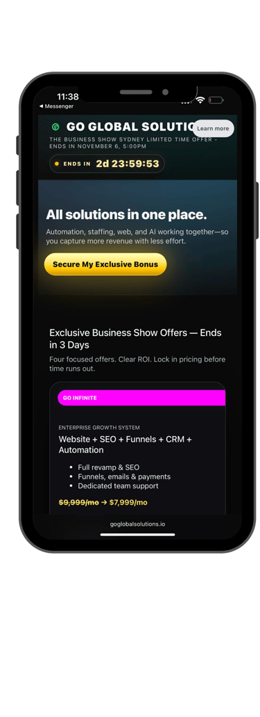 This funnel was crafted for a business show event by Go Global Solution and is designed to showcase multiple service bundles (automation, staffing, web & AI) in one streamlined offer. The landing page presents a time-sensitive “Exclusive Business Show” deal, combining urgency with value and clarity.