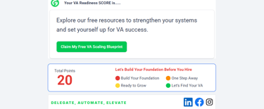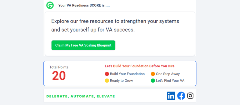 This allows the system to segment each visitor automatically and guide them toward the right next step (booking a call, downloading a resource, or learning more). By turning self-assessment into a guided, gamified flow, this funnel elevates perceived value, builds trust instantly, and positions the user as being “diagnosed,” which dramatically increases conversion into the next step. It’s a powerful lead-qualification tool that attracts serious prospects while filtering out non-ideal ones — making it highly effective for scaling VA or staffing services.