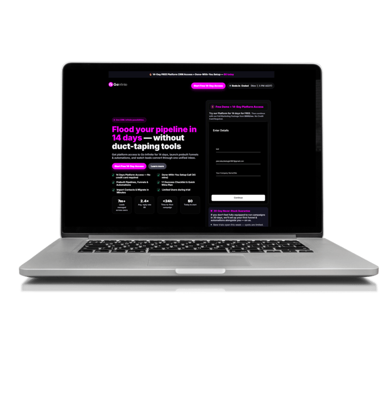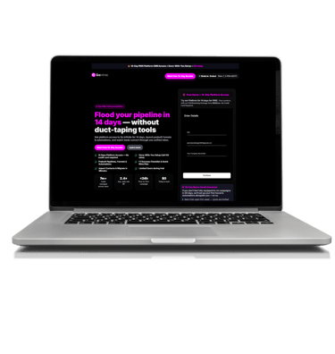 This funnel was designed to convert cold and warm traffic into scheduled product demos for a SaaS platform. The page uses a bold, outcome-driven headline (“Flood your pipeline in 14 days”) to immediately communicate value, paired with a dark, modern UI that highlights the offer with clarity and urgency.